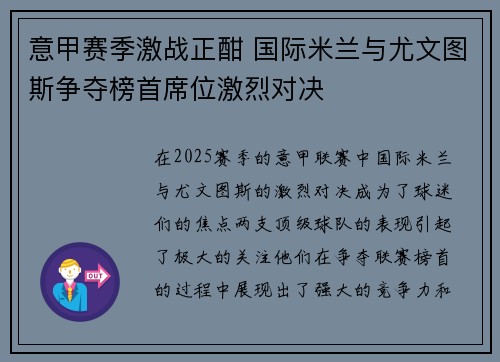 文章摘要:意甲联赛的争夺进入了一个新的高潮,尤文图斯与AC米兰这两支豪门球队的冠军之争成为了球迷们关注的焦点。随着赛季的深入,尤文图斯与AC米兰凭借出色的竞技状态和强大的阵容实力,在本赛季展现出了不同的风采,彼此的差距逐渐缩小,而赛季中的关键比赛也开始决定他们最终的命运。两队之间的较量不仅是一场纯粹的竞技对决,更是在战术、球员的发挥及精神面貌等方面的全面较量。本文将从阵容分析、战术打法、关键球员与...